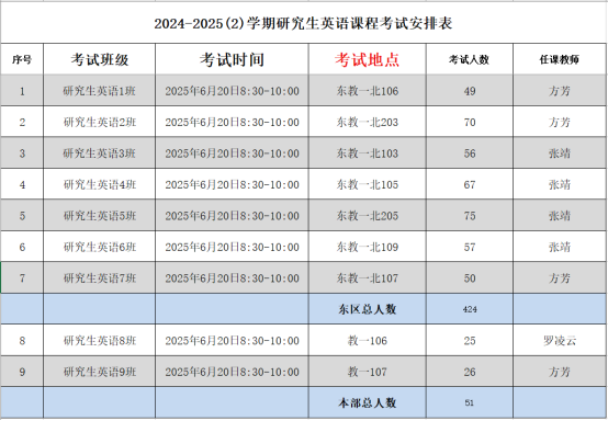 2024-2025(2)学期《研究生英语》课程考试定于2025年6月20日上午8:30-10:00进行,请相关研究生带好考试用品,严格按照《VSport研究生课程考试考场规则》的要求持有效证件准时到达指定考场参加考试。具体考场安排见附件。