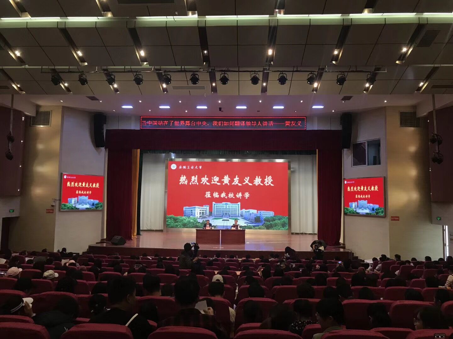 报告中,黄教授以自己翻译《习近平谈治国理政》以及三十余年丰富的翻译及从事翻译管理的经历,辅之以妙趣横生的翻译实例,为在座师生生动地讲解了实用的翻译方法和策略,他介绍了在翻译的过程中注重追求语言质量,减少翻译味的具体方法,译员需酌情采取一些翻译策略,以帮助受众准确理解领导人讲话内容。最后,他强调作为一名合格的翻译,还要具有语言意识、政治意识和读者意识(国际视野)。黄教授讲得绘声绘色,老师和同学们也受益颇多。黄友义教授就在座师生提出的计算机辅助翻译与人工翻译的关系、语气翻译、各类信息的翻译等问题做以详尽的解答。