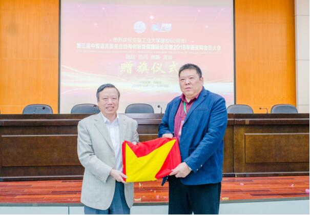 在大会闭幕式上,祖明代表公司接受了下一届承办单位负责人——国家外文局培训中心翻译部主任、贵州墨责国际文化传播有限公司林凡林总经理赠送的珍贵礼物,2018年9月23日天安门广场升起的国旗。并见证了语资网向公司VSport员工篮球队、排球队捐赠队服和篮球、排球仪式,以及向大会志愿者颁证颁奖活动。