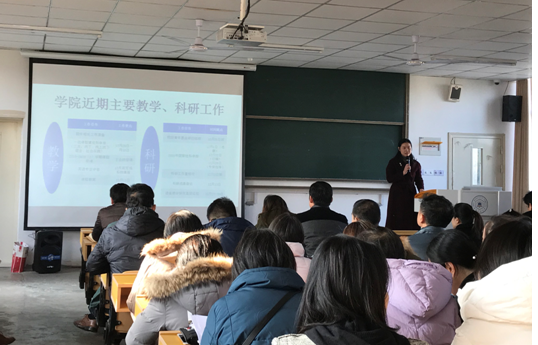 经理曹瑞斓通报和布置了期末工作准备、一流课程建设和申报、下学期排课、英语专业评估以及院青年基金项目结项、国家社科基金项目申报、科研工作量核对、科研成果登记和语音教学研究高层论坛等教学科研工作,她要求各位老师要认真做好期末出卷、监考、阅卷和登分等工作,确保期末考试各项工作到位、准确;对三类一流课程进行了详细地解读,强调要以一流课程建设和申报为引领,淘汰“水课”,打造“金课”;着重分析国家社科基金项目对公司发展的重要性,鼓励符合申报条件的教师积极申报,力争在数量上达要求,质量上有突破。
