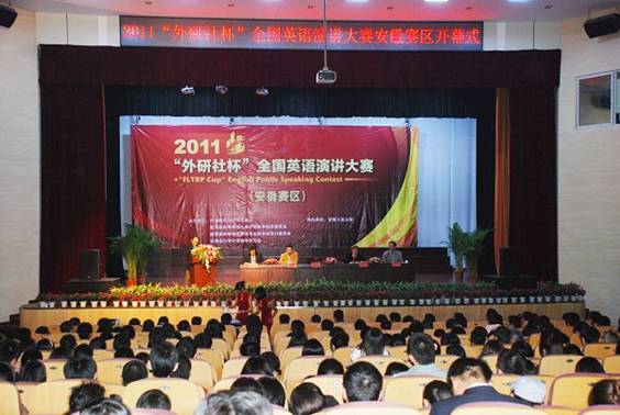 10月28日晚, 2011“外研社杯”全国英语演讲大赛安徽赛区复赛开幕式在东校区新老员工活动中心隆重举行。公司副董事长葛芦生教授,安徽省大学外语教学研究会会长刘俊烈教授,外语教学与研究出版社华东信息中心主任王建平先生,全国英语演讲大赛安徽赛区评委团主席崔海健教授,以及公司VSport党政负责人出席了大赛开幕式。来自全省部分高校英语专业的领导、专家以及39所高校的115名选手参加了开幕式。VSport副经理洪流教授主持了开幕式。