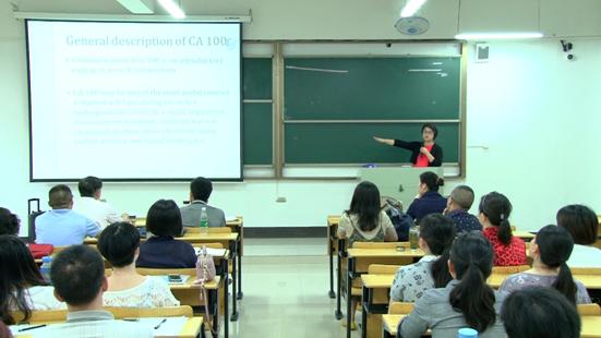 杨玲博士在美国有六年的教学与教学经历。她结合自己在国外的教学经历,从公共演讲课程概况、中美课堂对比以及英语公共演讲教学的难点三大方面介绍了美国公共演讲教学模式以及对我国英语课程建设的启示。她指出,公共演讲能力是可以训练的,通过听、说、读、写和思辨各个具体过程的积累,可以不断提高公共演讲能力。报告结束后,杨玲博士与公司教师进行了互动,气氛活跃,她细致地解答了老师们提出的疑问,获得现场老师们的好评。