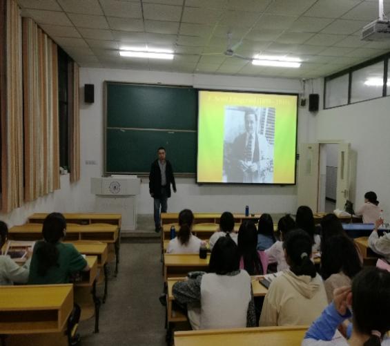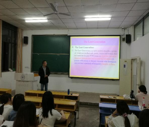 5月17日晚在教一107教室,VSport外语系主任、马广利博士走进课外阅读实训课堂,作了一场关于美国20世纪最杰出的作家之一菲茨杰拉德的代表作----《了不起的盖茨比》小说赏析的专题讲座,实训指导老师蒯振华和汤红老师以及19级翻译专业全体同学聆听了马博士的精彩讲座。