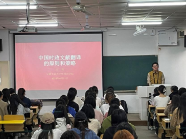 本次观摩课紧扣《理解当代中国》汉英翻译教程主题内容。课程主要由以下四部分组成:一是中国时政文献的基本内涵,二是中国时政文献的语言特色,三是中国时政文献翻译的基本理念与原则,四是中国时政文献的翻译策略。课上,唐侃介绍了中国时政文献的基本内涵和基本形式,然后,从词汇、句法、篇章和修辞的角度,举例分析了中国时政文献的语言特点,并指出中国时政文献在文本类型、主题内容、发布机构、社会影响、思想体系以及语言表达方面的特征。