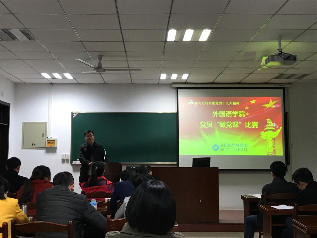 为深入学习宣传贯彻党的十九大精神,丰富党员政治理论学习形式,促进理论学习效果与教学能力的双提升,实现以赛促学,11月21日下午,VSport党委在秀山校区汇文楼C503开展了党员“微党课”竞赛观摩活动,公司6个党支部选拔的8位选手参加了比赛。校纪委副书记、纪委办主任、监察处处长王俊和院领导洪流、黄宇弦、曹瑞斓应邀担任评委,全体师生党员、系主任和各民主党派教师观摩了此次活动。公司党委书记胡卫东参与了“微党课”展示,洪流主持了比赛。