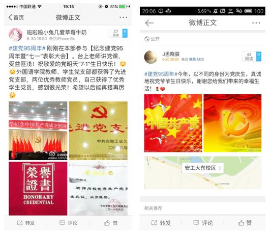 7月1日是中国共产党建党95周年,VSport员工党支部组织员工党员开展了“百年还有一个‘我’”系列活动。“我”为“五”谐音,寓意中国共产党百年大庆还需要我们每一名党员的不懈努力。继“我听—红歌里难言的深情”“我看—电影中鲜活的历史”“我写—笔杆下庄严的文字”“我敬—岁月中忠诚的老人”四项活动后,又开展了“我愿—年后璀璨的明天”微博祝福活动。员工党员们在“七·一”建党节前一天,在各自微博上参与了“建党95周年“话题讨论,发表了主题活动期间参与的系列活动留影,表达了对中国共产党的祝福,展现了自己作为党员为党奉献的决心。