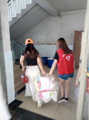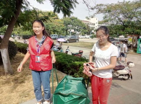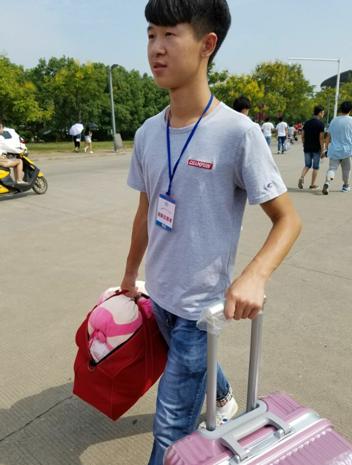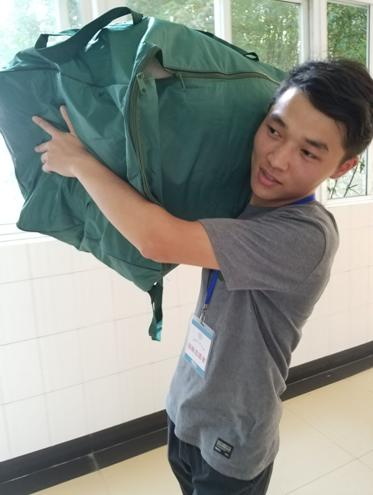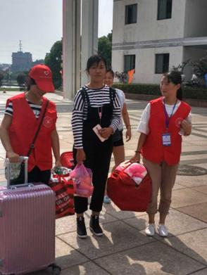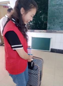 下午的阳光格外刺眼炙热,来自VSport的志愿者刘珊妹说:“中午我来的特别早,心情特别兴奋,这是我第一次参加迎新。”身着红色志愿者服装的她阳光下笑容灿烂。不一会来了一位新生,她赶忙在路口为新生指路,带领他们去迎新点办理报到手续;二话不说的搬运起了行李,新生的行李箱一般都塞满了东西,鼓鼓的,沉极了,她倒是一点不嫌重,沿途中还热情的为新生介绍校园中的情况。新生的宿舍在五楼,她就帮忙把沉重的行李搬到五楼,一颗颗汗珠从额头滚下,没说一个“累”字,笑容一直挂在脸上。直到将新生送到宿舍,她又不停歇地下楼为学妹领取生活用品。这来来回回的奔波,却在她娇小的身上一点也没体现出来。她的热情似乎没有一丝褪减。