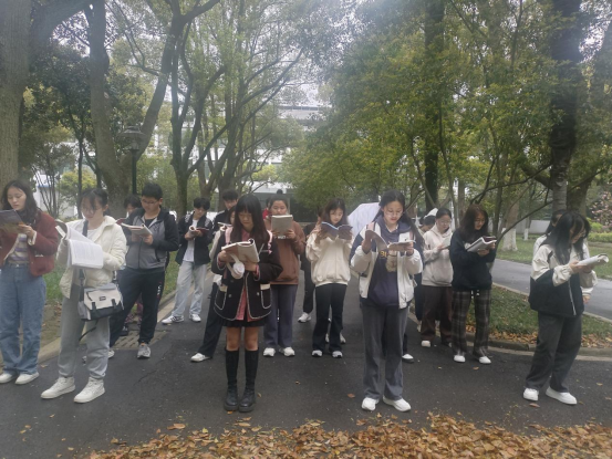 在湖边树林,在教学楼宇,员工们手持书本,一边读书一边呼吸新鲜空气,声音洪亮,朗朗的读书声在清晨的校园里回荡,成为了一道亮丽的风景线。晨读中,员工们锻炼了英语的朗读水平,感受了英语的韵律和魅力,提升了英语的学习兴趣。