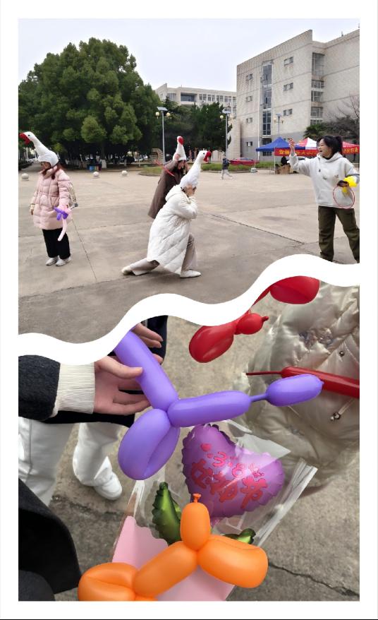 活动区域人气高涨,“套大鹅”考验技巧与运气的同时,为节日增添童趣;“创意折气球”环节,女生们将普通气球扭成花朵、小狗等造型,展现巧手与创意;“踩气球大战”则通过团队竞技释放压力,欢笑声与气球爆破声交织,成为全场焦点。最后,此外,活动师生在“闪耀青春”主题合影展板纷纷拍照留念,记录自信笑容。